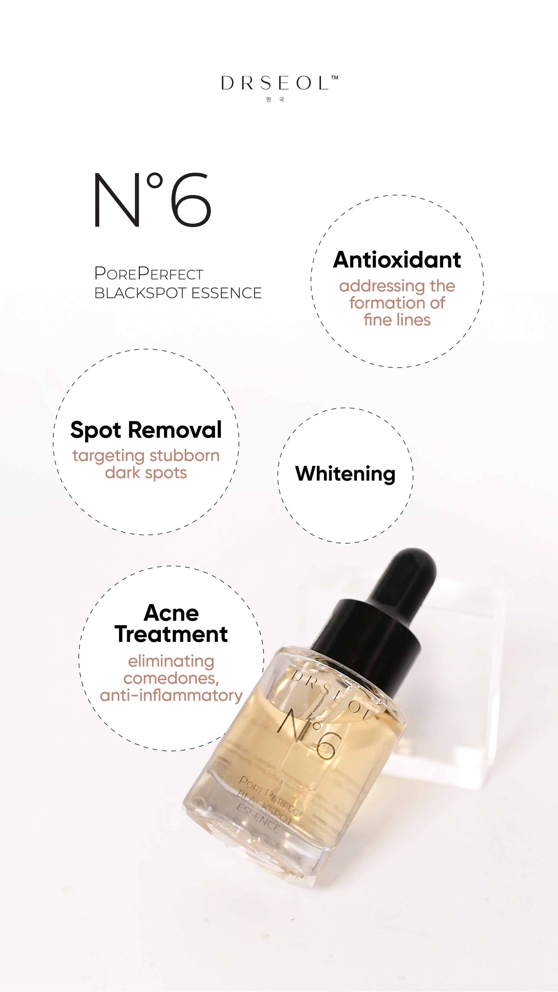 Experience flawless skin with our N6 PorePerfect Blackspot Essence! Our super serum targets spots, removes pimple scars, and reduces pore size. The anti-oxidant formula also whitens and controls oil production for a glowing complexion. Say goodbye to blemishes and hello to confidence!